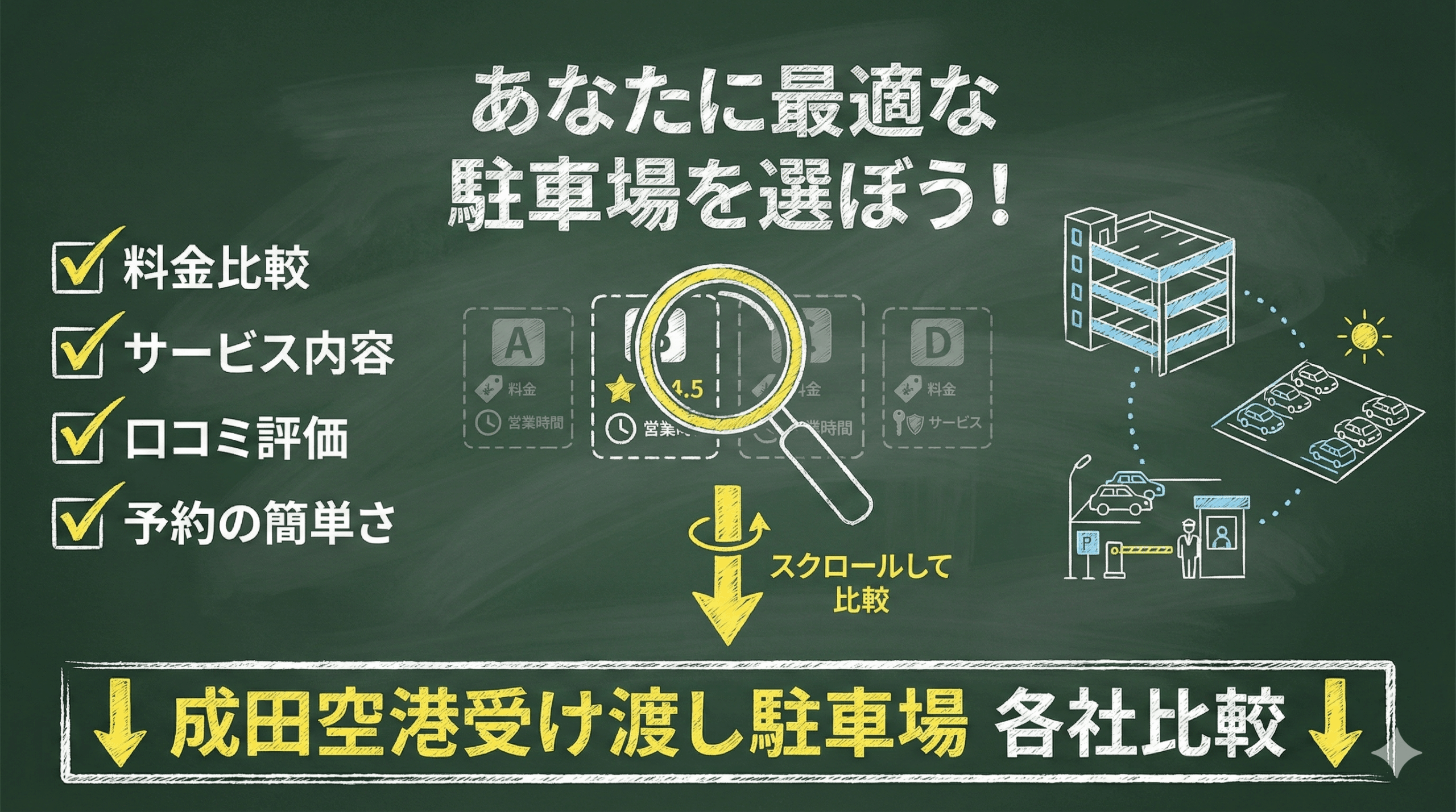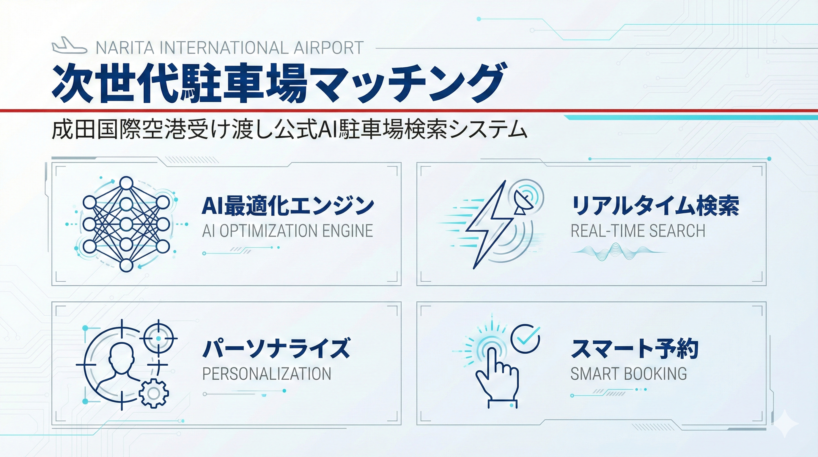 成田空港(第1・第2・第3ターミナル)での車両受け渡しに対応した駐車場サービスを、AIが瞬時に検索・比較します。 「ビジネスで時間を節約したい」「LCC利用でとにかく安く済ませたい」「家族旅行で安心できるサービスがいい」など、あなたの目的に最適な駐車場プランをご提案します。