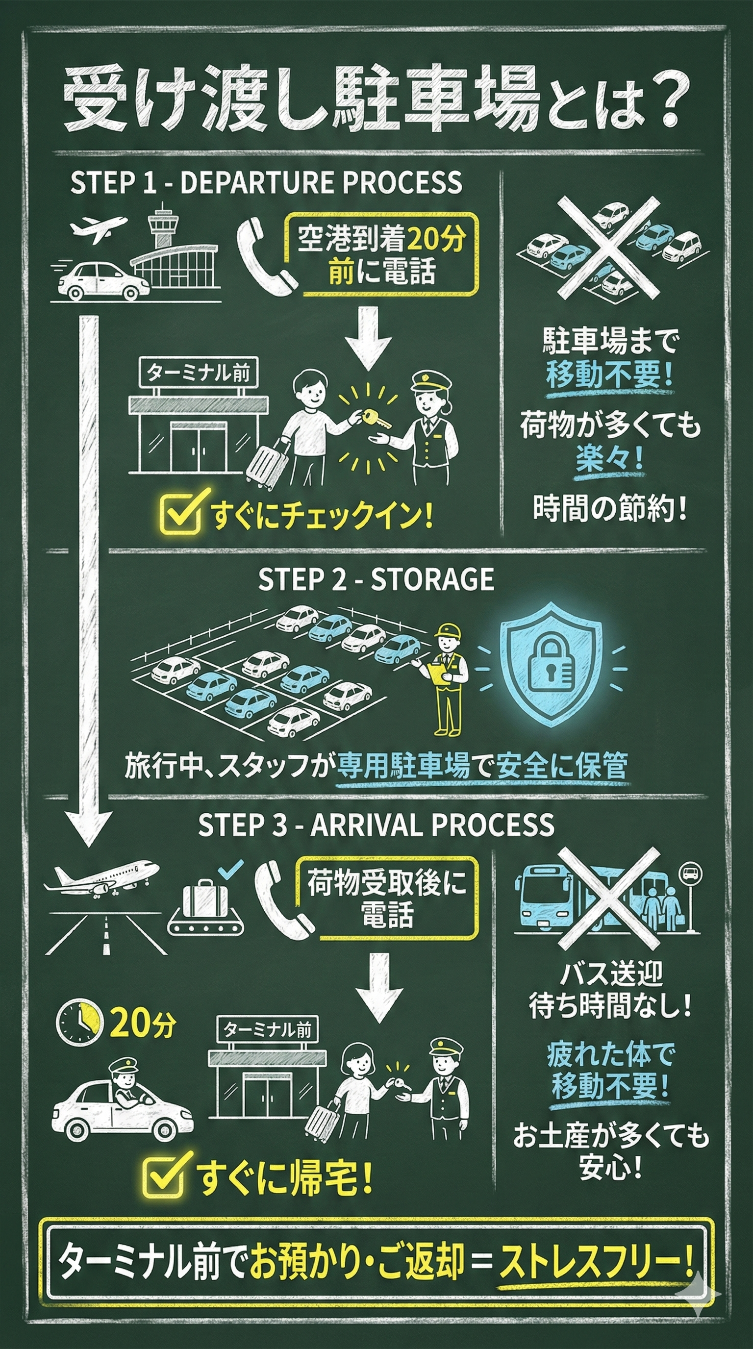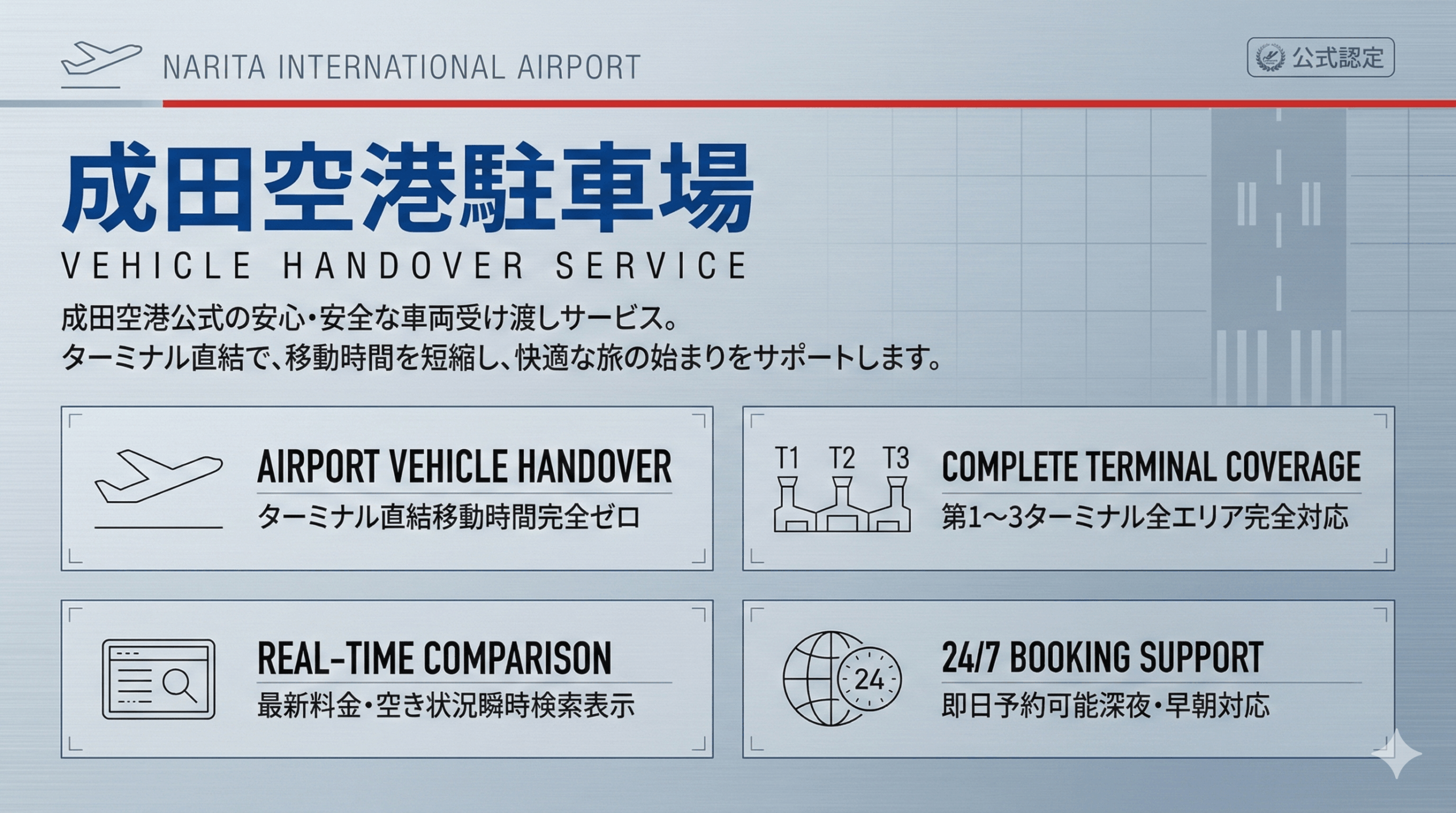 成田空港の駐車場には「空港渡し(バレーパーキング)」と「店舗送迎」の2種類がありますが、当ツールでは移動時間がゼロになる空港渡しサービスに特化して検索しています。 特に第3ターミナル(LCC)ご利用時は、一般車の乗り入れ規制があるため、LCC対応の専門業者を選ぶことが重要です。